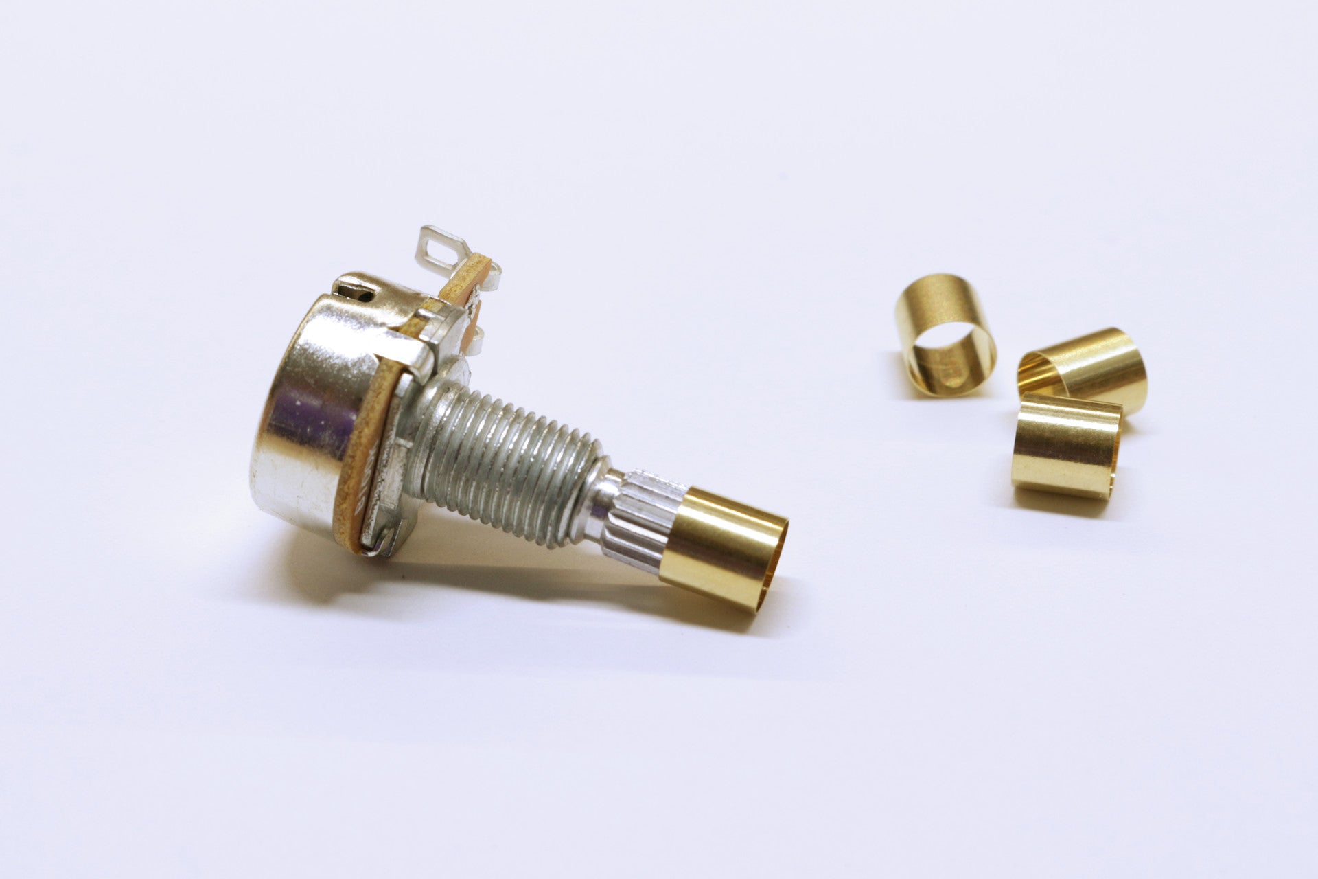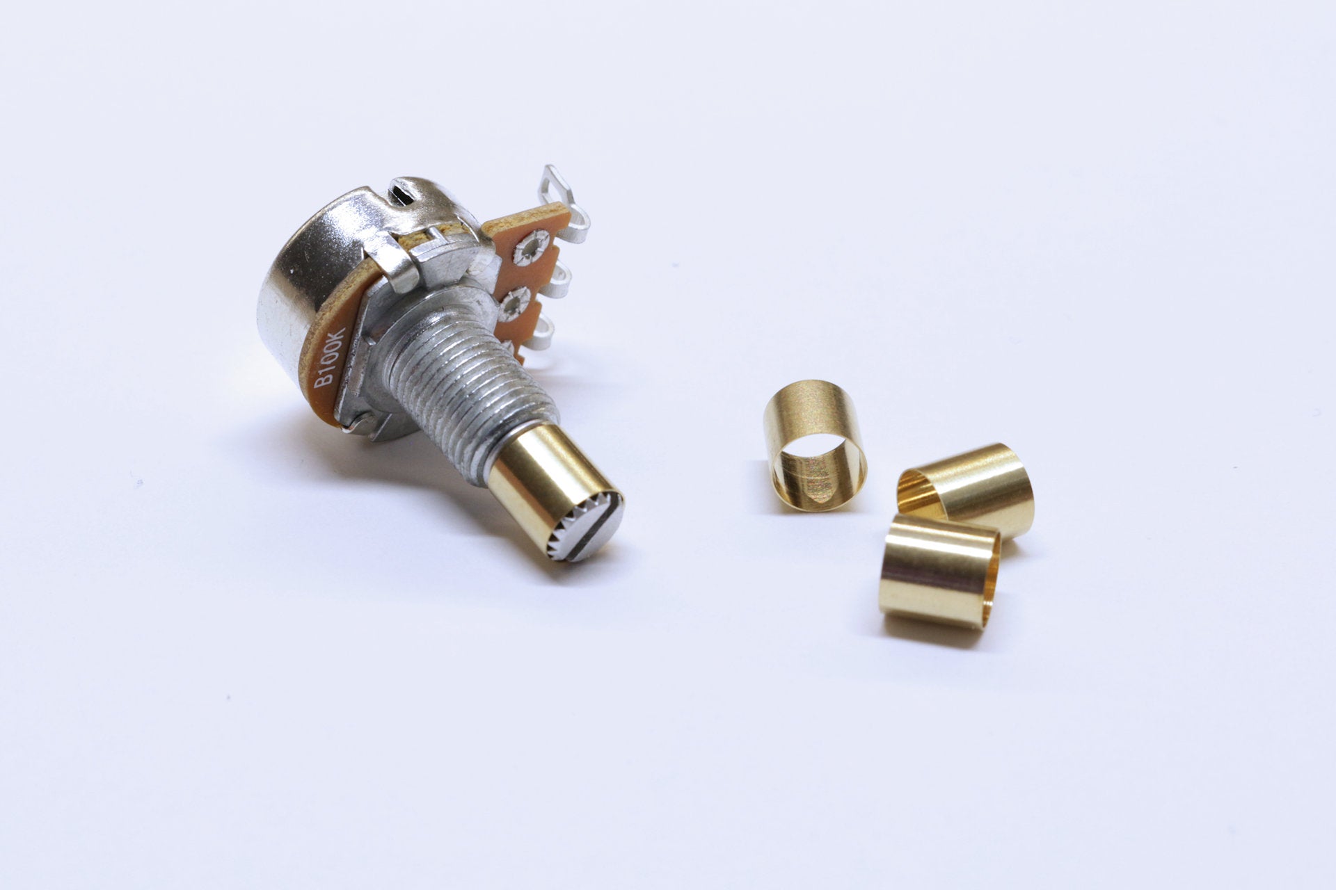 These brass bushings are designed to perfectly fit over 6mm knurled potentiometer shafts to provide a solid 1/4 inch surface that fits perfectly with 1/4 inch knobs that use set screws.